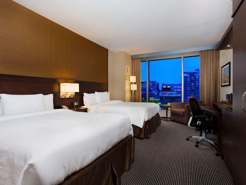 Nos 212 chambres spacieuses (d'une superficie moyenne de 38 mètres carrés) sont confortables, élégantes et équipées d'une climatisation à réglage individuel afin que vous puissiez choisir l'environnement qui vous convient. Toutes les chambres et suites sont équipées d'un accès Internet haut débit filaire et sans fil gratuit, d'un téléphone, de stations de recharge USB, d'un grand bureau et d'une chaise ergonomique confortable. Nos chambres sont toutes équipées d'une cafetière haut de gamme, d'un mini-réfrigérateur (70 litres), d'un sèche-cheveux, d'un fer et d'une planche à repasser, d'une télévision HD LED à écran plat de 109 cm, d'une radio AM/FM et d'un coffre-fort.